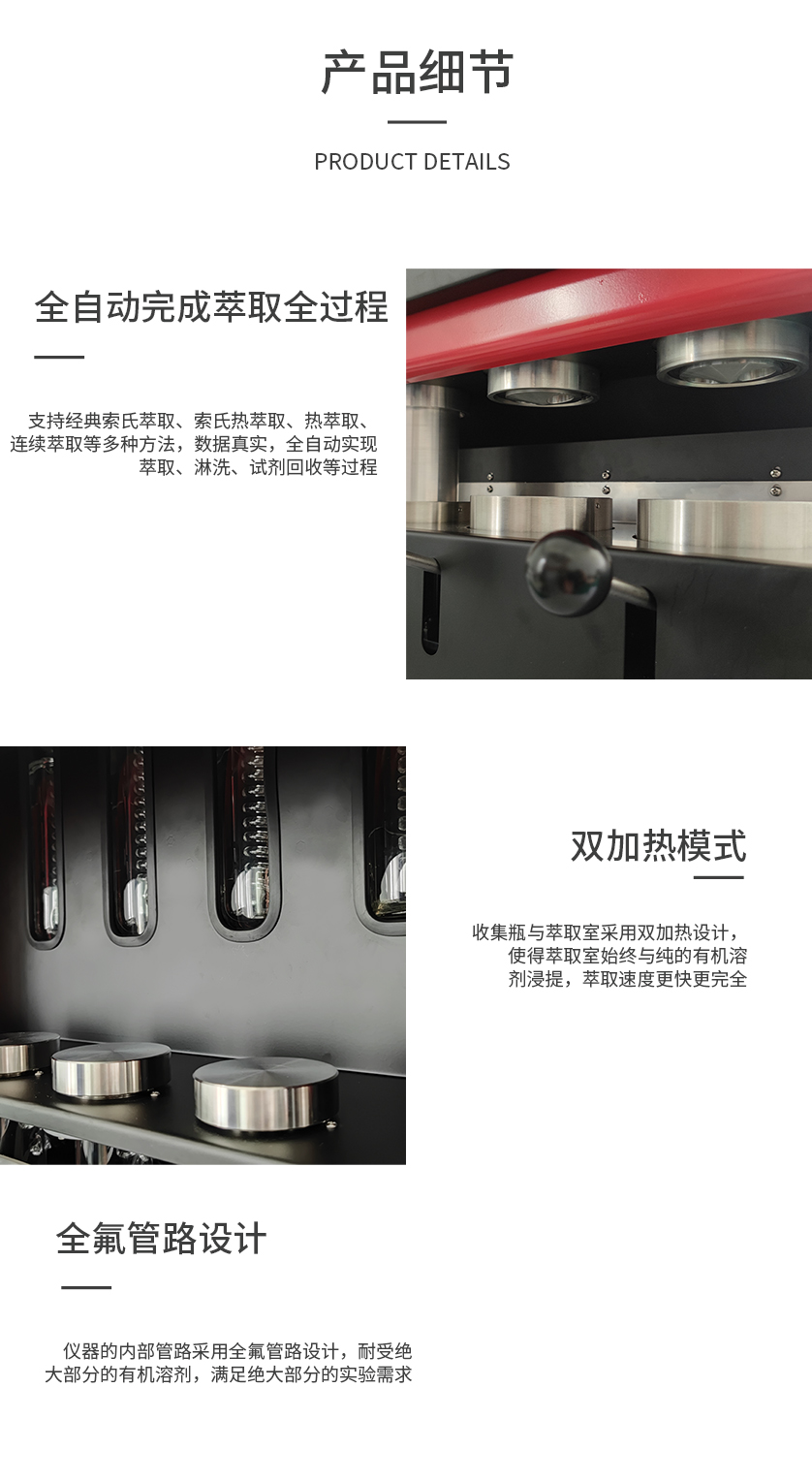 02 >實現全程熱浸泡萃取,收集瓶與萃取室雙加熱,萃取速度快,比傳統索氏提取法縮短20%~80%提取時間