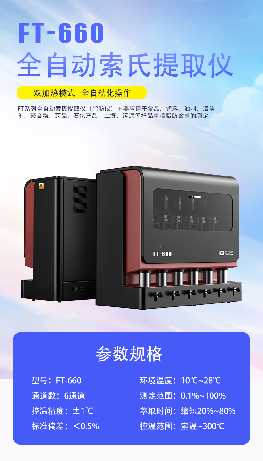 FT-660全自動索氏提取儀(脂肪測定儀)主要應用于食品、飼料、油料、清潔劑、聚合物、藥品、石化產品、土壤、污泥等樣品中粗脂肪含量的測定。