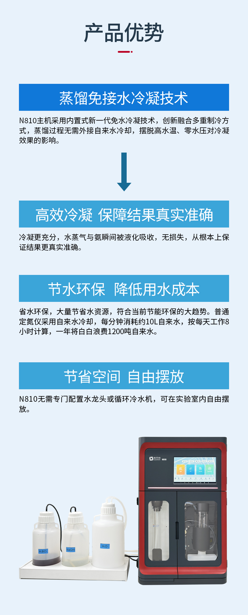 新一代N810免水全自動凱氏定氮儀,突破了傳統凱氏定氮儀依賴外接水源或冷水機冷凝的局限,搭載免水冷卻系統,既提升了實驗的準確度與效率,更增強了儀器運行的可靠性。這一創新設計,大幅節省了外接冷卻水循環機的采購成本與日常水資源開支。儀器集成免水冷凝、自動加堿加酸、加注稀釋劑、蒸餾滴定、消化管排空、溶液液位監測、超溫預警、清洗排廢、結果智能計算等全流程功能,實現凱氏定氮實驗的無人值守式操作。儀器采用符合國家標準的凱氏定氮方法:濃硫酸環境消解樣品、堿性環境蒸汽蒸餾、硼酸吸收、加指示劑滴定、終點顏色判定法。