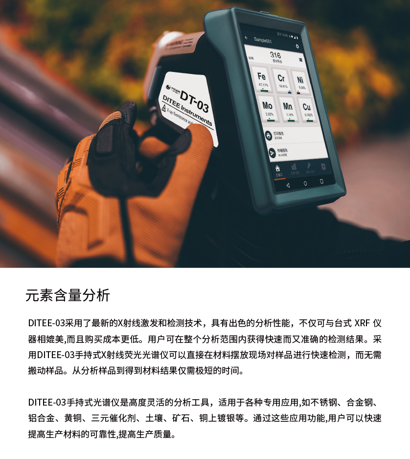 由于DITEE-03手持式光譜儀采用的是X射線熒光光譜技術,所以可以對材料進行完全無損地檢測,任何材料在檢測過程中都可以保持原來的形態,無需特殊的前處理。通常DITEE-03手持式光譜儀可以檢測固體、液體、粉末等不同形態的材料。