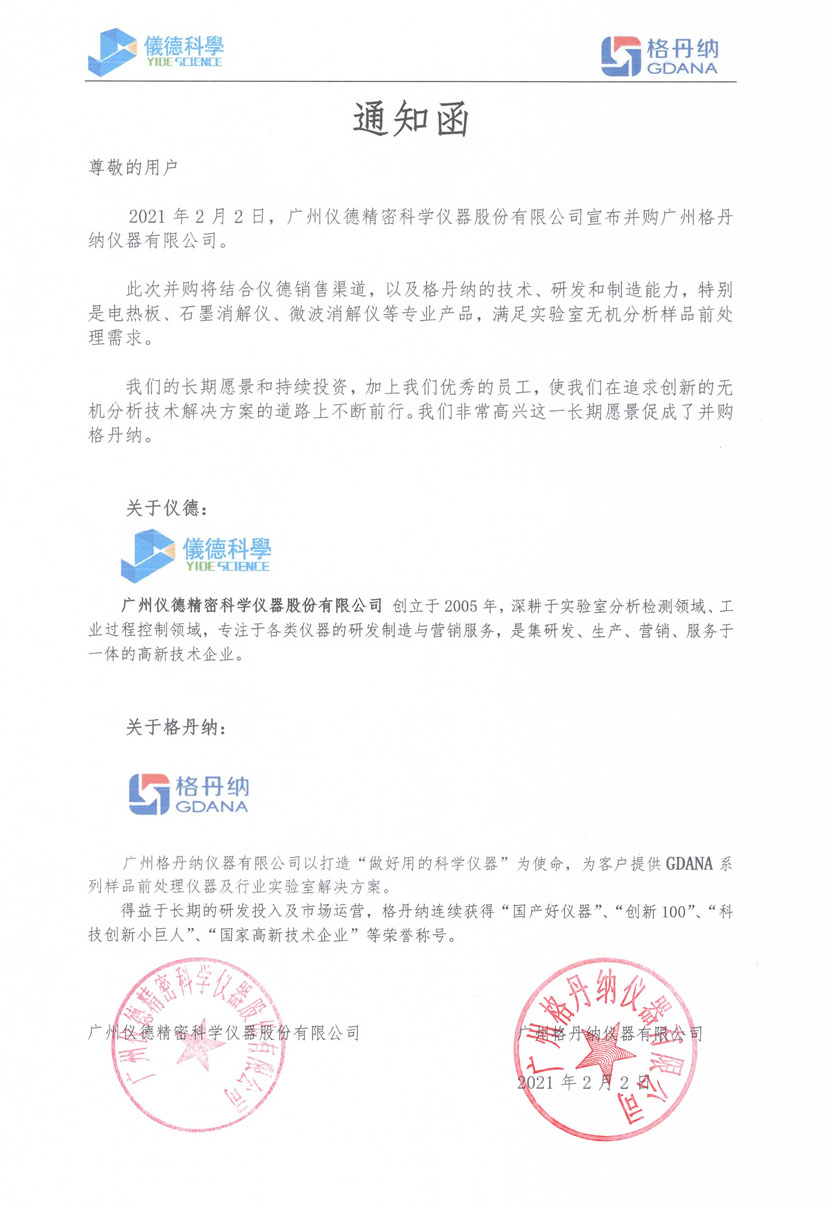 為進一步促進企業(yè)的發(fā)展,推動公司并購重組工作,茲廣州儀德精密科學儀器股份有限公司于2021年2月2日正式并購廣州格丹納儀器有限公司,特此聲明。